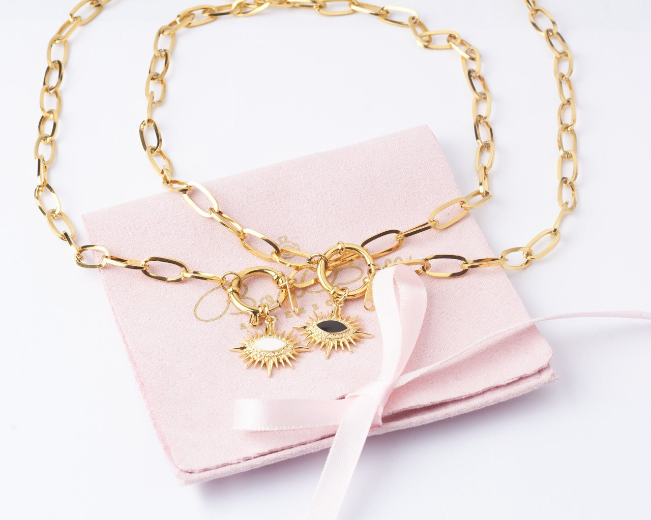 MATERIAL: Acero inoxidable con baño de oro, broche en acero inoxidable y dije esmaltado.