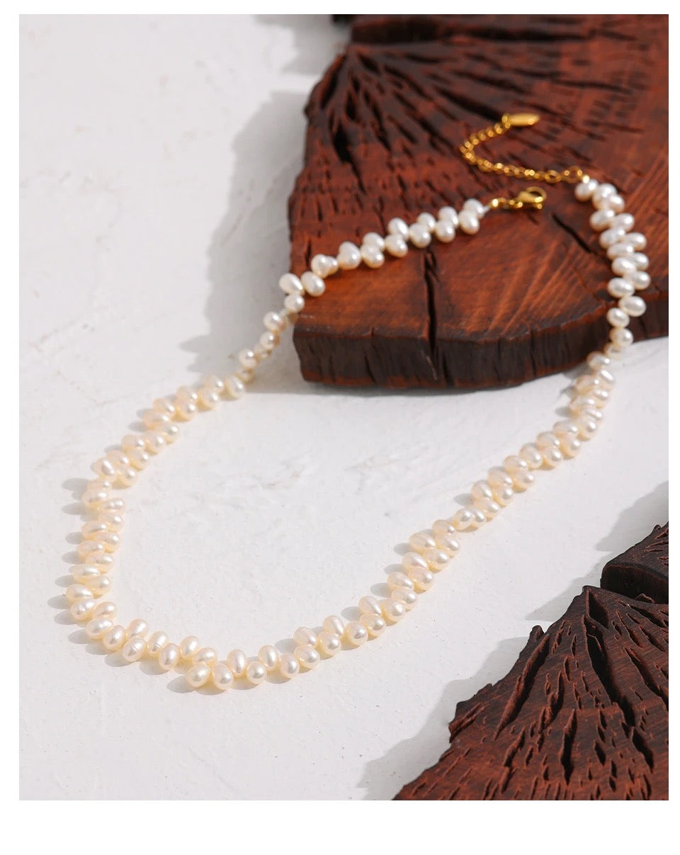 Collar artesanal elaborado en Perla natural entrelazada con terminaciones en acero inoxidable.