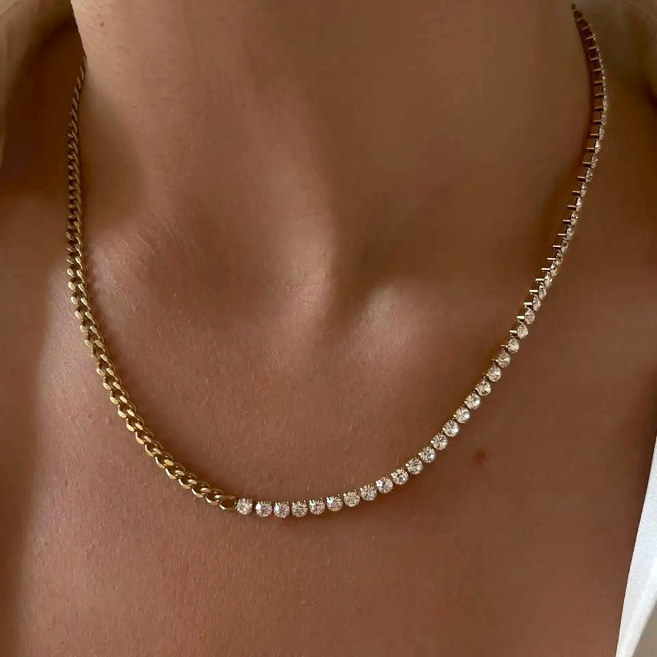 Collar y pulsera estilo Tennis combinada con cadena en color dorado con zirconia, este accesorio es perfecto para darle un toque elegante y de brillo a tu outfit.