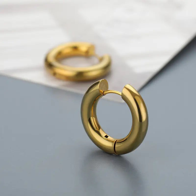 Aretes lisos de Acero Inoxidable con baño de oro 18K, de 2.5 cm de diámetro tamaño mediano.