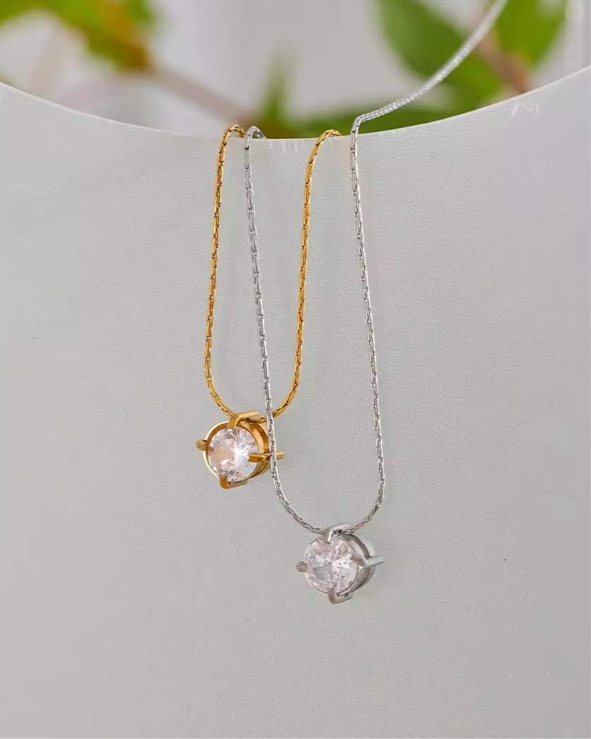 Nuestro collar Issa está elaborado en acero inoxidable bañado en oro de 18K y piedra Circonia blanca.